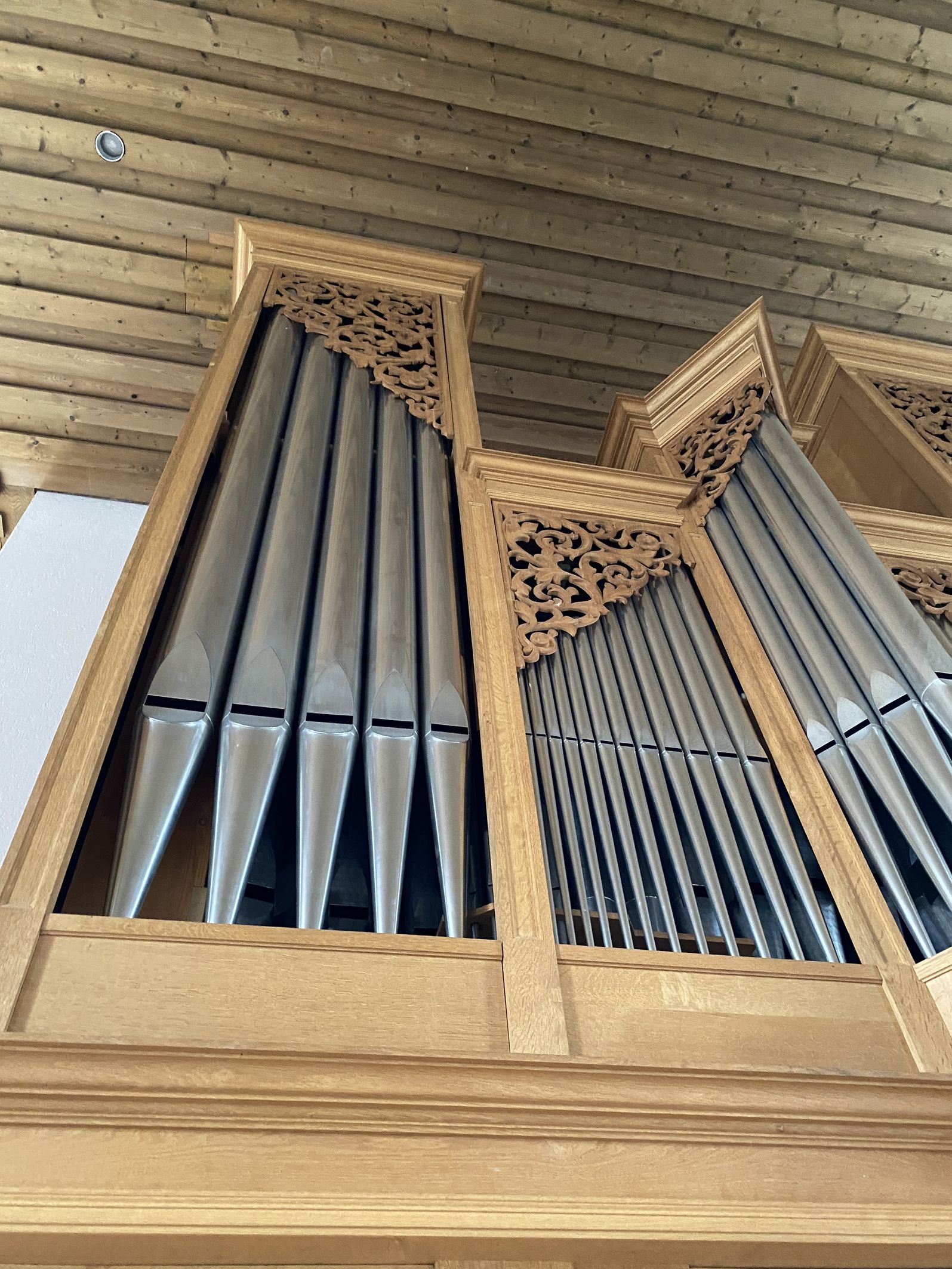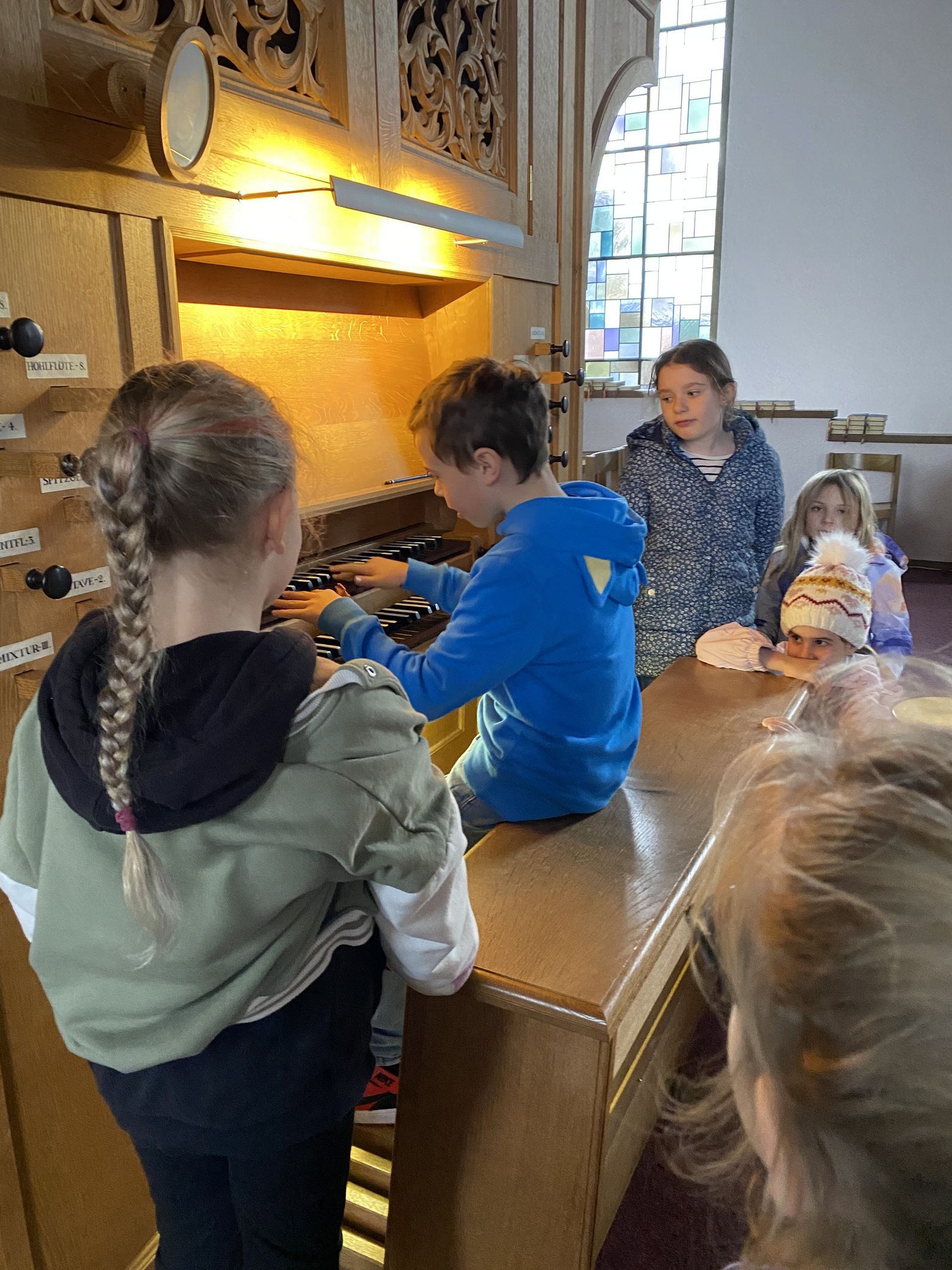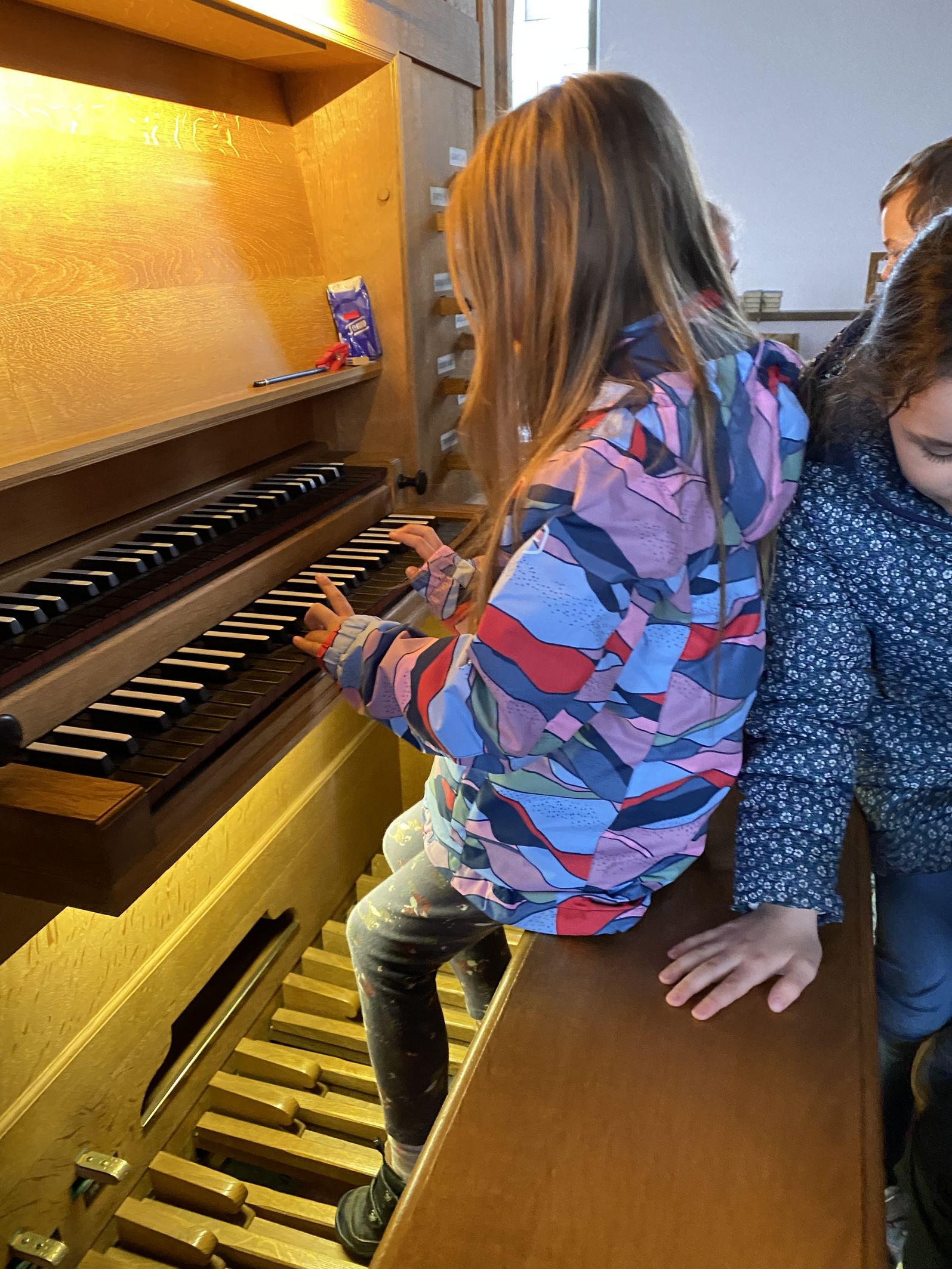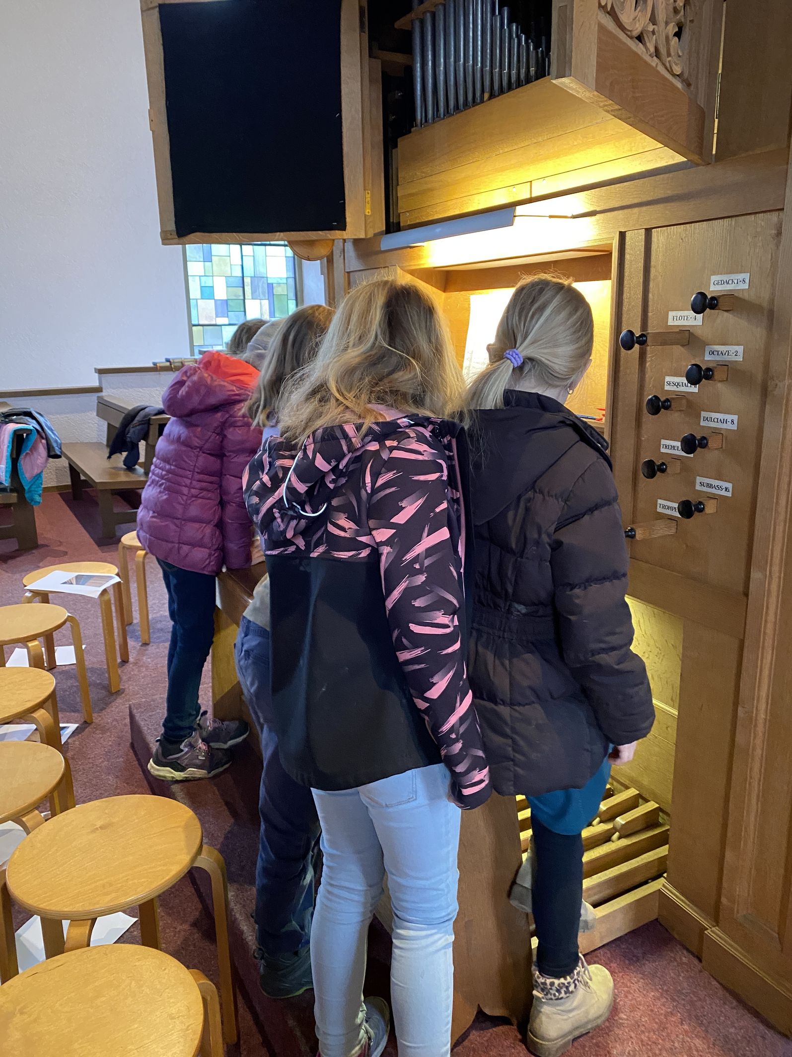 Aufgrund von Bildern mussten die Kinder die einzelnen Teile der Orgel erkennen und lernten so deren Funktionsweisen kennen. Schnell war klar, dass ohne Strom auch bei der Orgel nichts geht und zuerst ein Gebläsemotor gestartet werden muss. Bald schon konnten die Kinder den Pfeifen verschiedenste Töne entlocken indem sie fleissig Tasten und Pedale drückten und verschiedenste Register zogen.