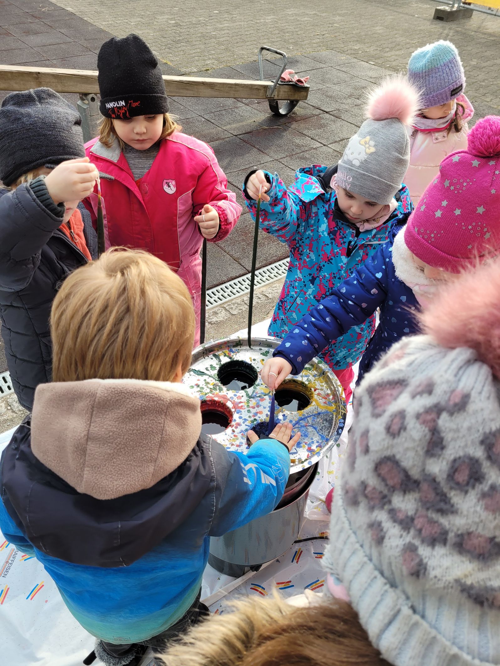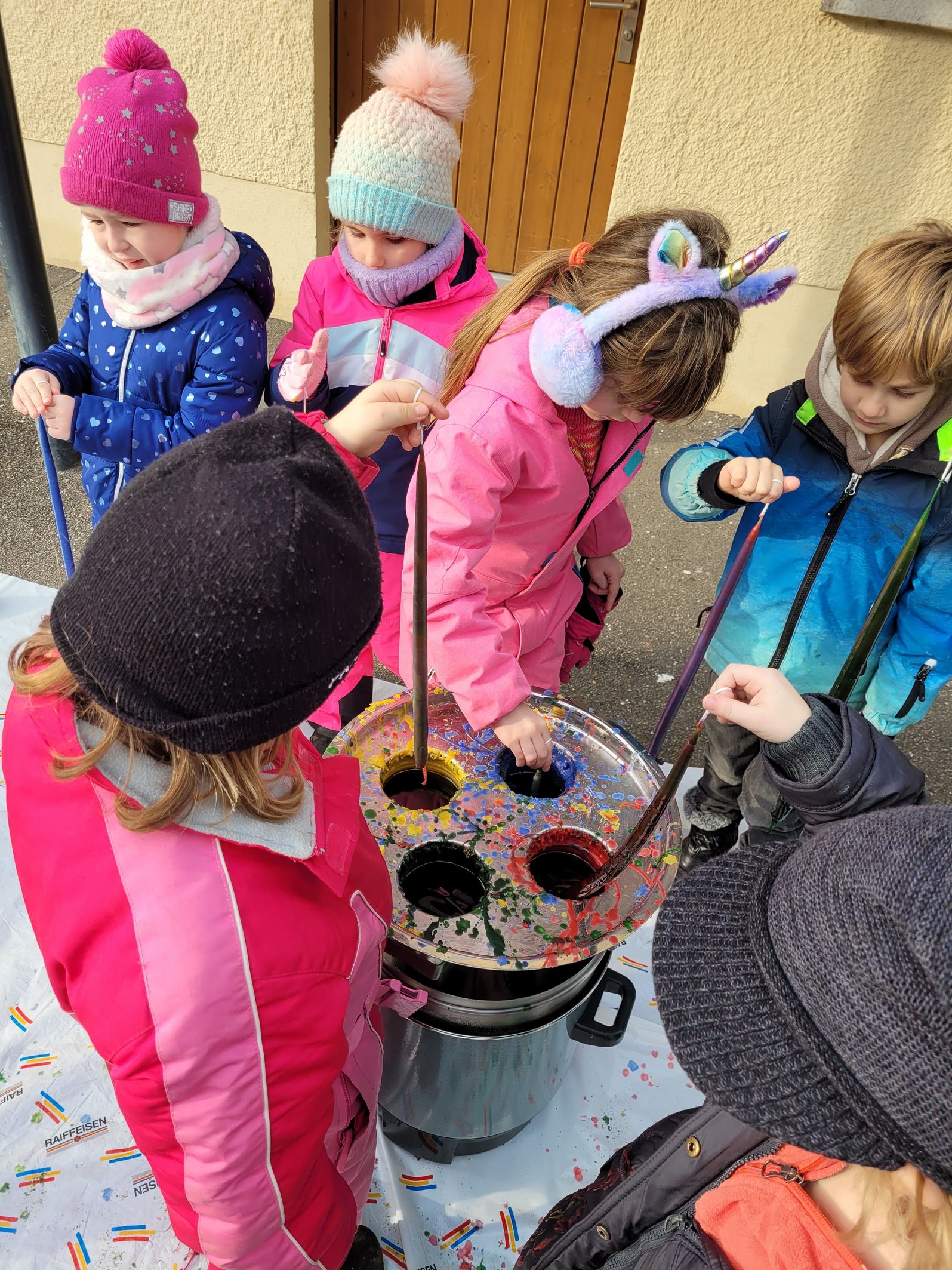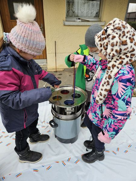 Die Schülerinnen und Schüler durften in diesem Jahr bei wunderbarem Wetter und kalten Temperaturen draussen Kerzen ziehen. Es entstanden viele wunderschöne Kunstwerke, die mit Freude gestaltet wurden.
