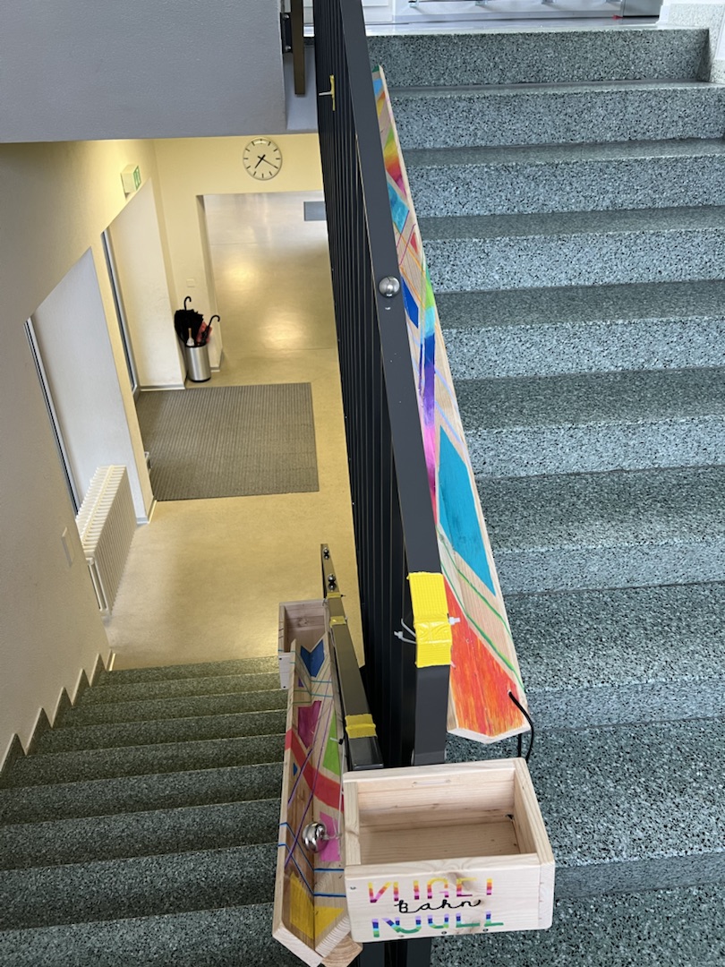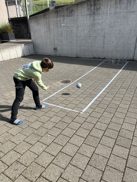 Die Kinder der 5.Klasse haben in diesem Schuljahr in Gruppen einige Projekte rund um das Schulhaus realisiert. Es ging darum, von der Idee, über die Planung, Budgetierung, Bewilligung bis zur Fertigstellung die einzelnen Schritte zu erleben. Einzelne Ideen mussten auch gestrichen, andere angepasst werden, bis sie realisiert werden konnten. Folgender Projekte wurden umgesetzt: Kegelbahn auf dem Pausenplatz, Schachbrett, Kugelbahn im Treppenhaus, Korridordekoration und Leseecke im Gruppenraum.