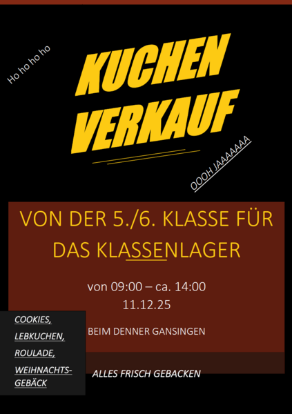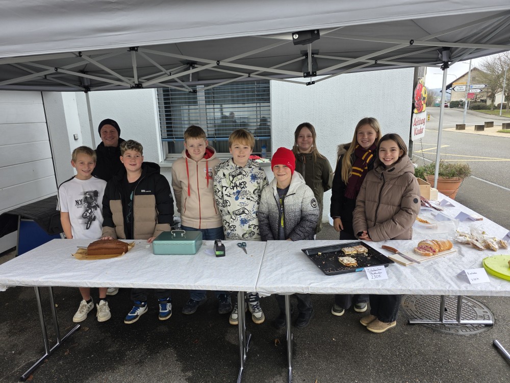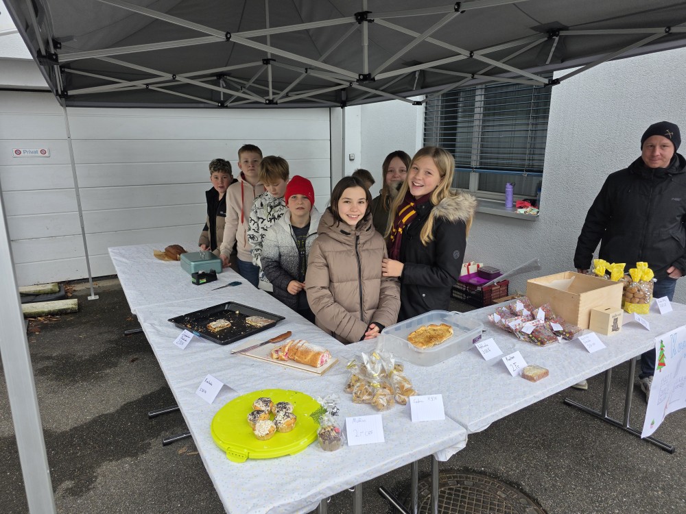 Die Schülerinnen und Schüler der 5. und 6. Klasse aus Gansingen haben am 11. Dezember mit grossem Einsatz Kuchen, Guetzli, Muffins und allerlei andere feine Sachen produziert um sie anschhliessend beim Dorfplatz zu verkaufen. Alle waren aufgeregt und gespannt, ob der Verkauf Anklang findet im Dorf. Es herrschte reges Treiben am Donnerstagmorgen im Schulhaus, die Bäckerinnen und Bäcker haben den ganzen Morgen ohne Unterbrechung weitere Leckereien produziert um für genügend Nachschub zu sorgen. Die 5. und 6. Klasse dankt auf diesem Weg allen Besuchern, die die Aktion unterstützt haben und oft sogar mehr ins Kässeli gegeben haben, als der Kuchen kostete. Der Erlös fliesst in die Kasse fürs Klassenlager der 5. und 6. Klasse.