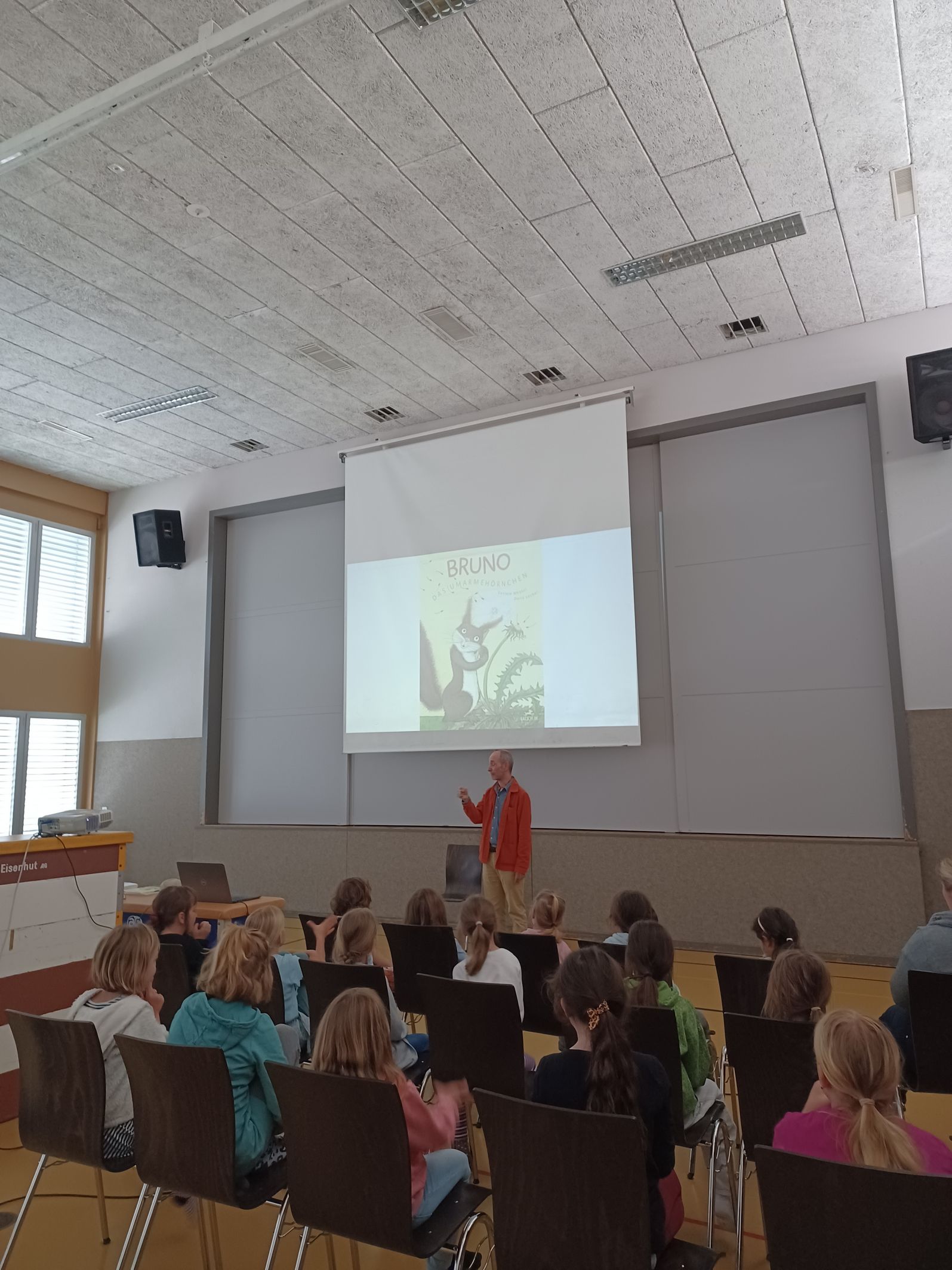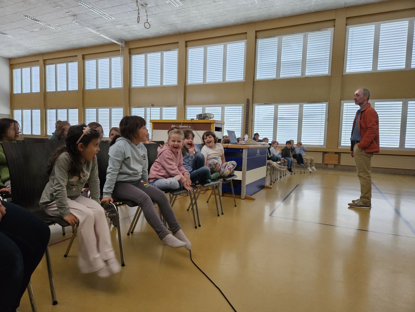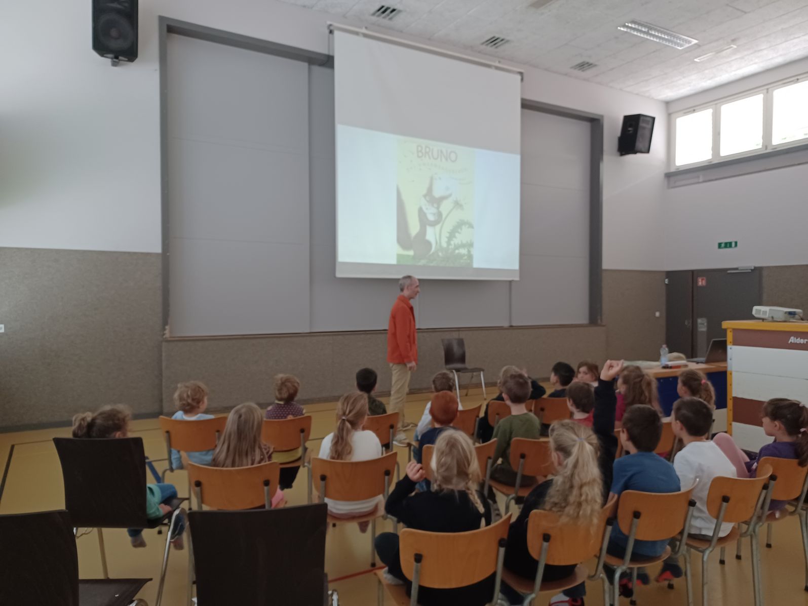 Daniele Meocci erzählte im Rahmen des Kulturanlasses sein Bilderbuch «Bruno das Umarmehörnchen». Gespannt lauschten die Kindergartenkinder und die Kinder der 1. und 2. Klasse der Erzählung, entdeckten auf den Bildern allerlei Spannendes und lernten am Ende noch ein Lied zum Bilderbuch.