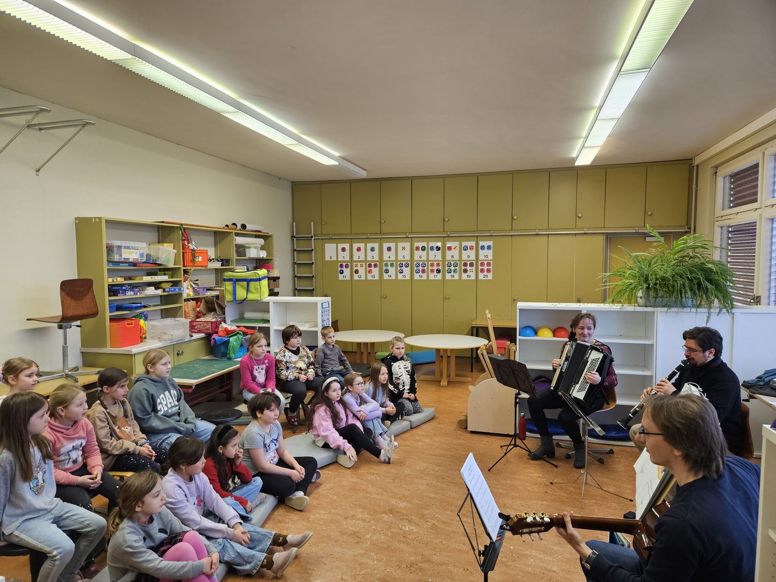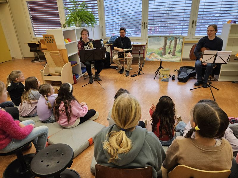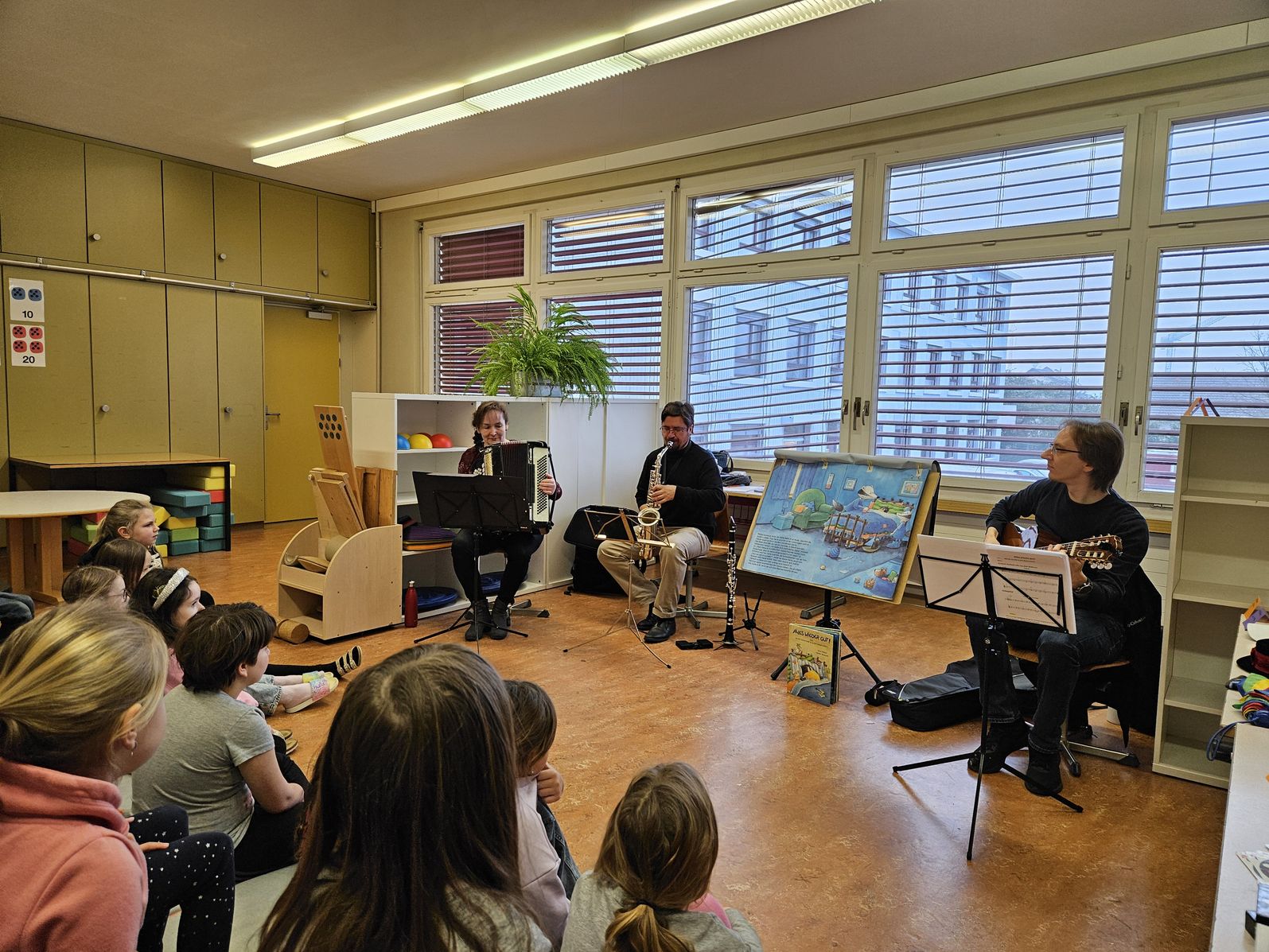 Die Musikschule Region Laufenburg besuchte die Kinder der 1. und 2. Klasse mit einem Musikmärchen. Sie erzählten den Kindern die Geschichte vom Raben Socke und wie er zu seinem Namen kam. Die Geschichte wurden von den Musiklehrpersonen musikalisch begleitet und untermalt, was die Spannung noch mehr steigerte und den Morgen für die Kinder zu etwas Wunderbarem werden liess.