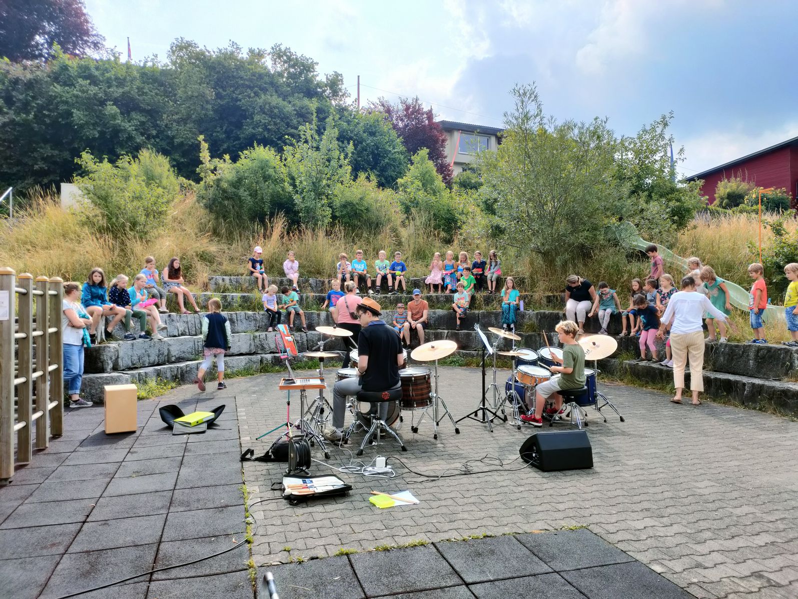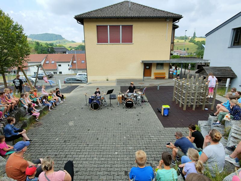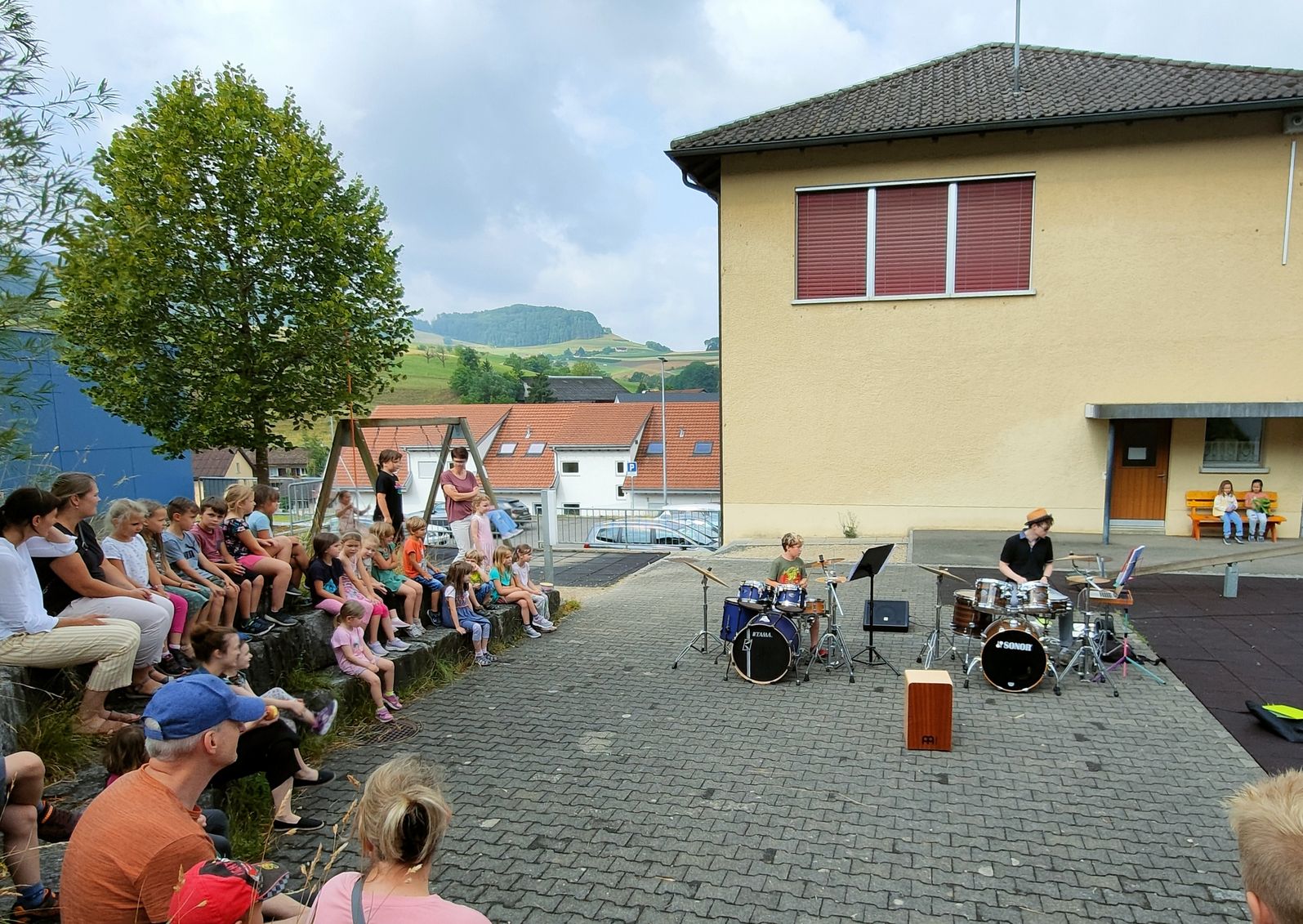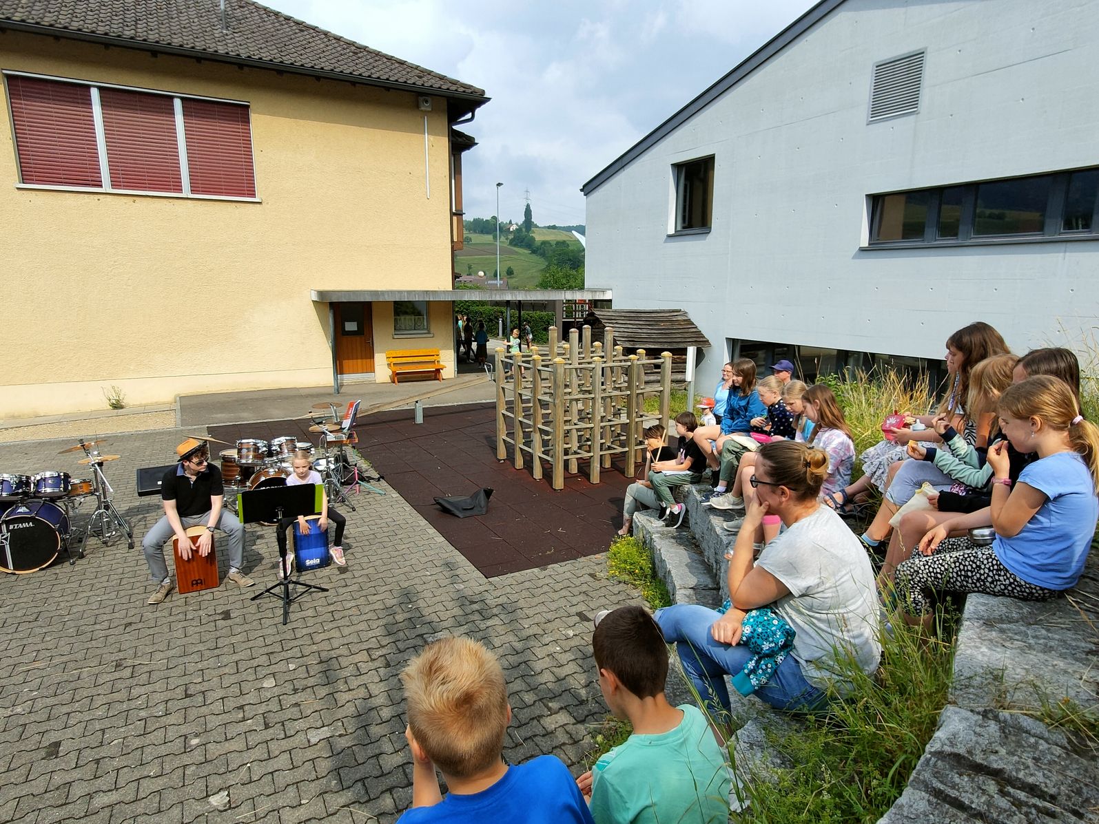 Am 23. Juni 2023 hat Michael Büchi von der MSRL gemeinsam mit seinen Musikschüler/innen Elouan, Nael, Zoé und Salome in der grossen Pause für musikalische Unterhaltung gesorgt. Herzlichen Dank an die motivierten Kinder und die Musiklehrperson für die rythmischen Klänge.