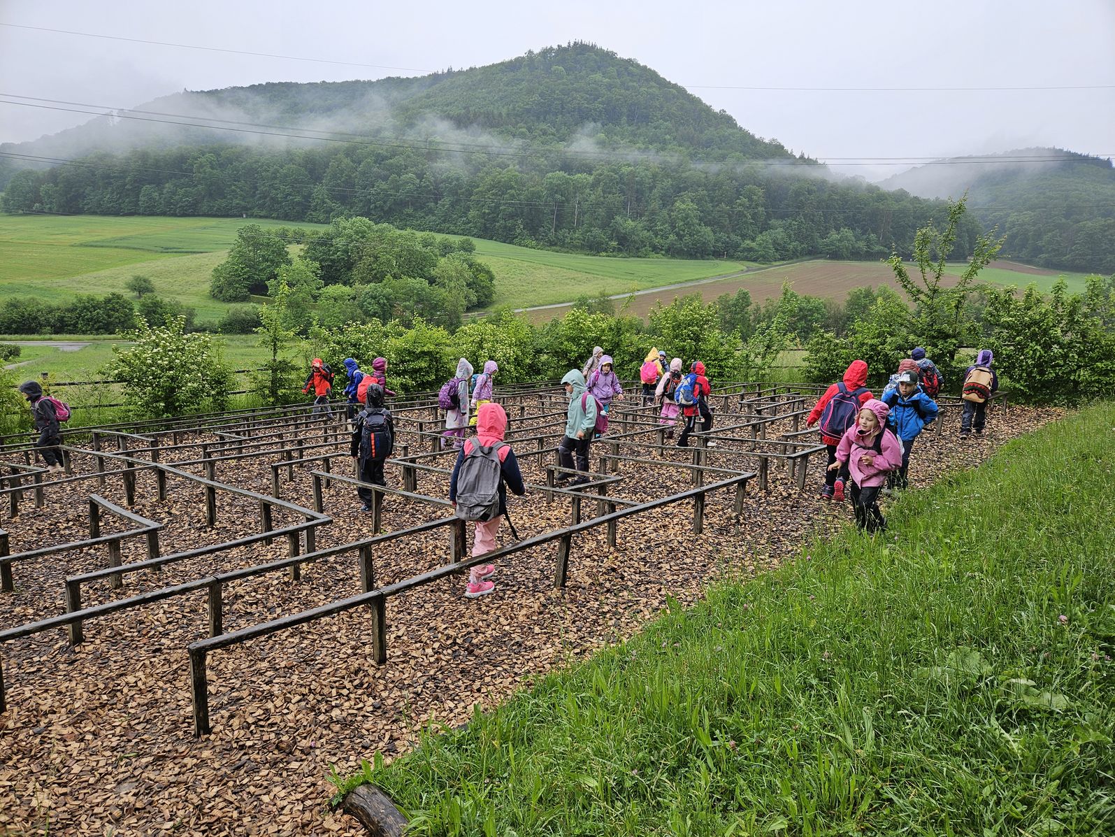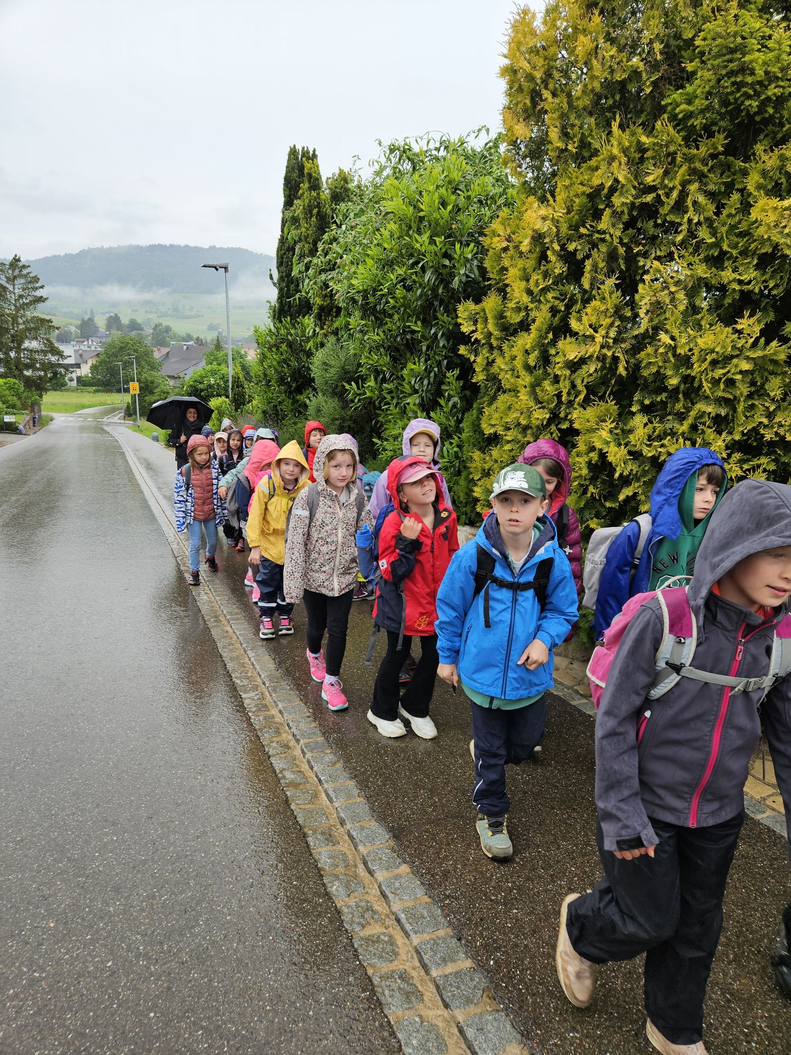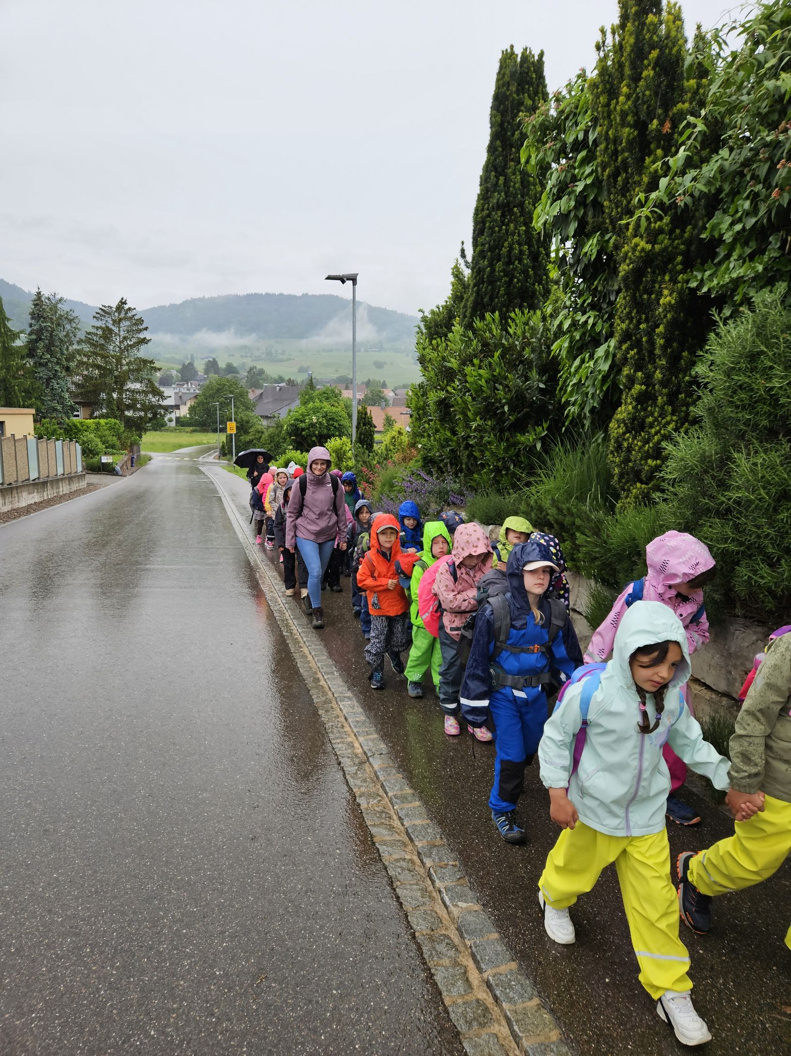 Die Kinder des Kindergartens und der 1. und 2. Klasse machten sich am Donnerstagmorgen gut gelaunt auf den Weg nach Gipf-Oberfrick um den Sinnespfad zu erforschen. Die Kinder liessen sich die Stimmung vom nassen, schlechten Wetter nicht verderben. Es waren aber dennoch alle sehr froh, als sie sich auf den Heimweg machten und die nassen, kalten Hände und Füsse wieder aufwärmen konnten