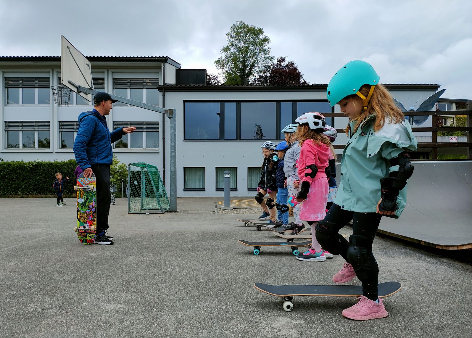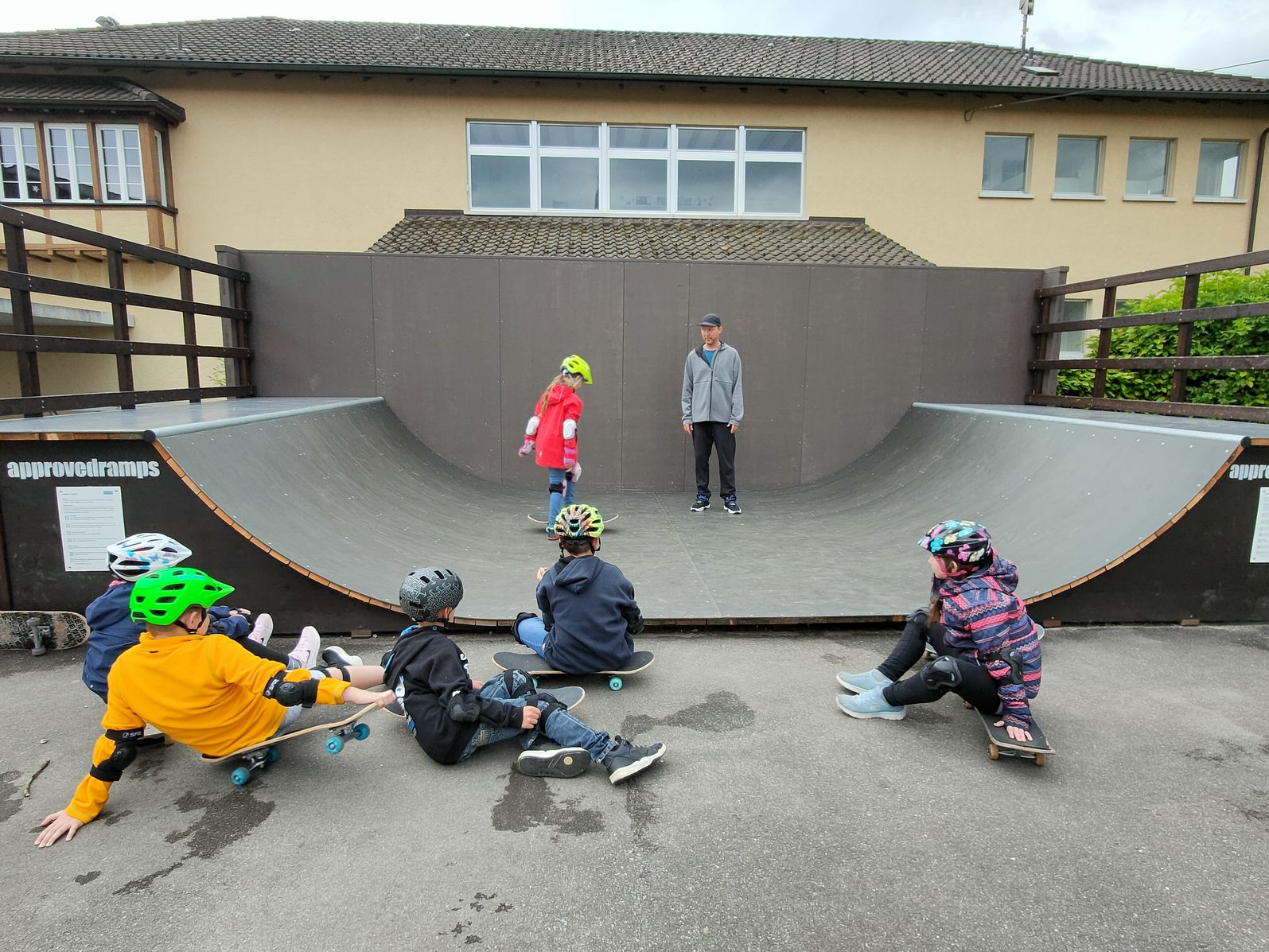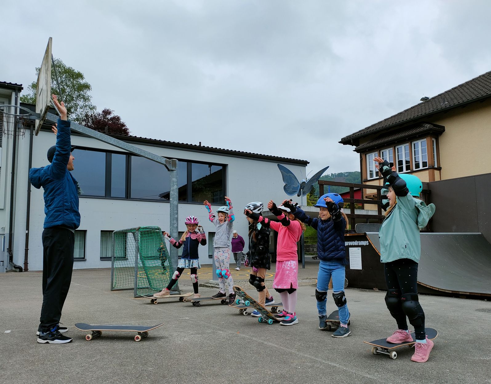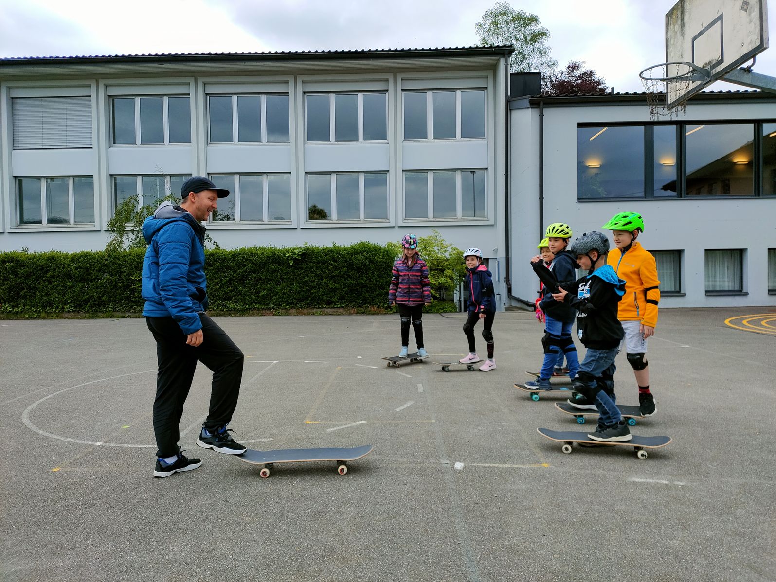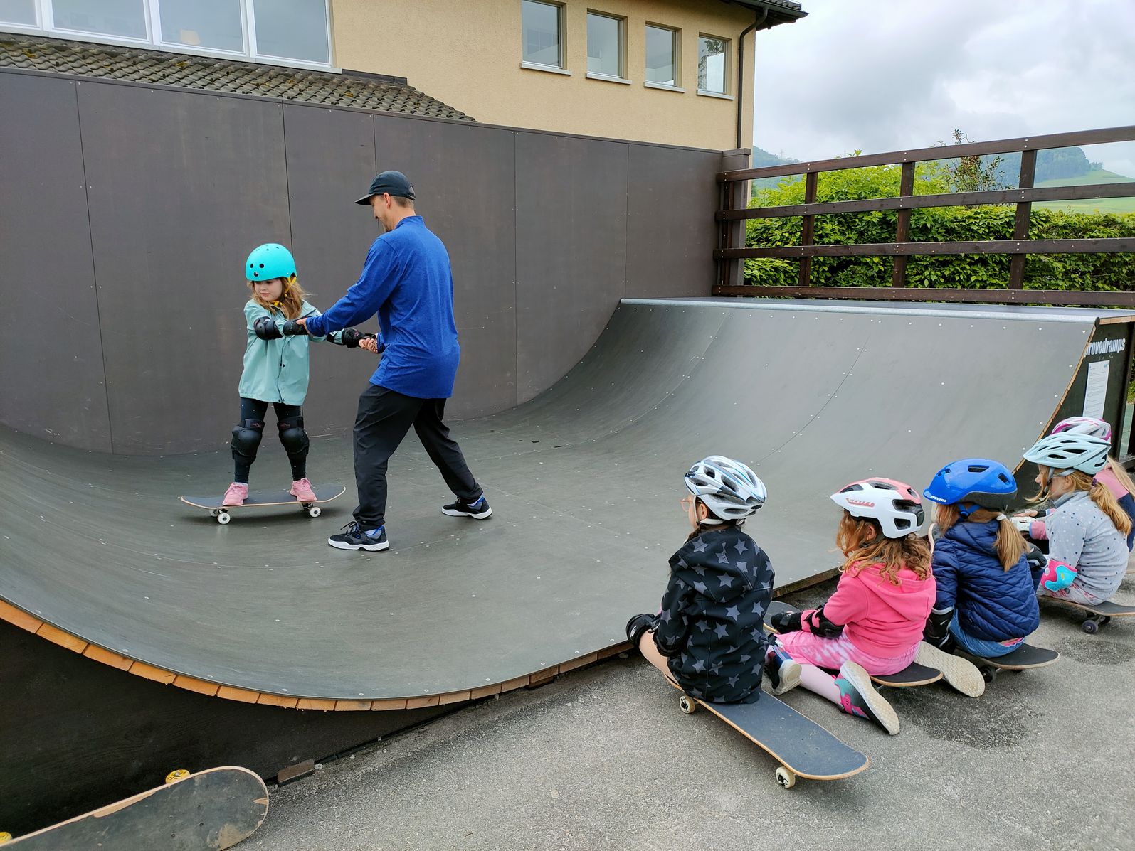 Seit Februar steht sie endlich, unsere Miniramp. Damit alle Kinder, die gerne möchten, erlernen können, wie man ein solche benutzt, hat der Skateboardlehrer Simon Krauer die 1. - 6. Klässler am 15. und 16. Mai 2023 in den Turnstunden besucht.