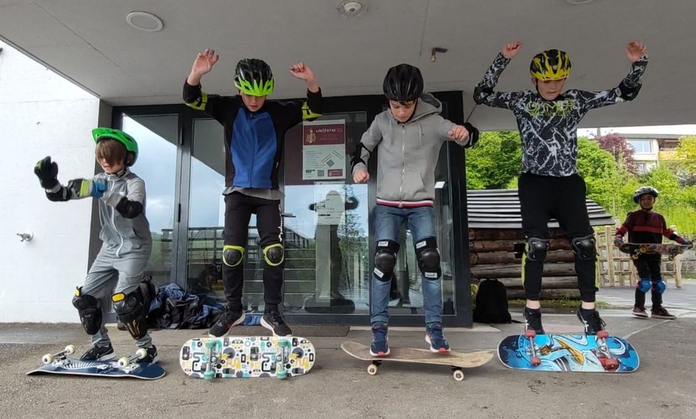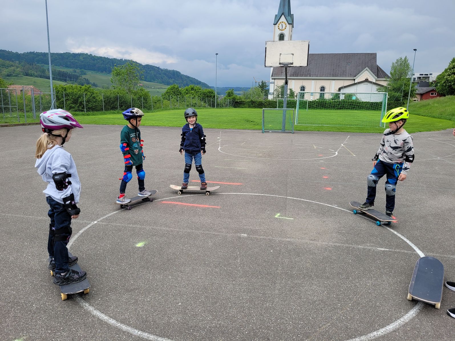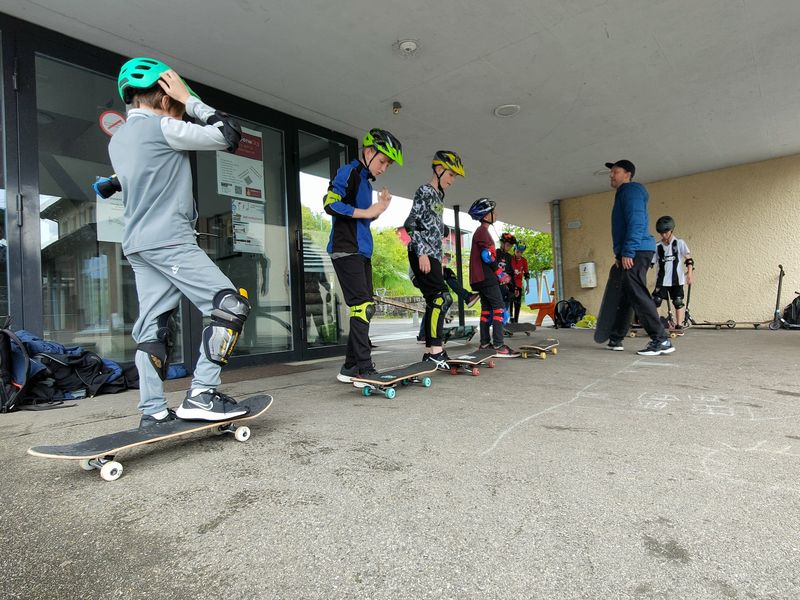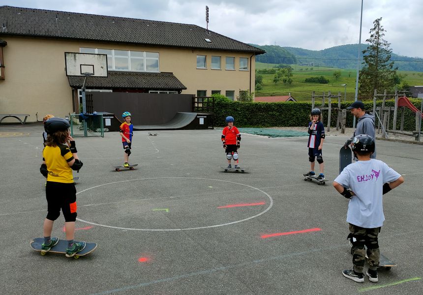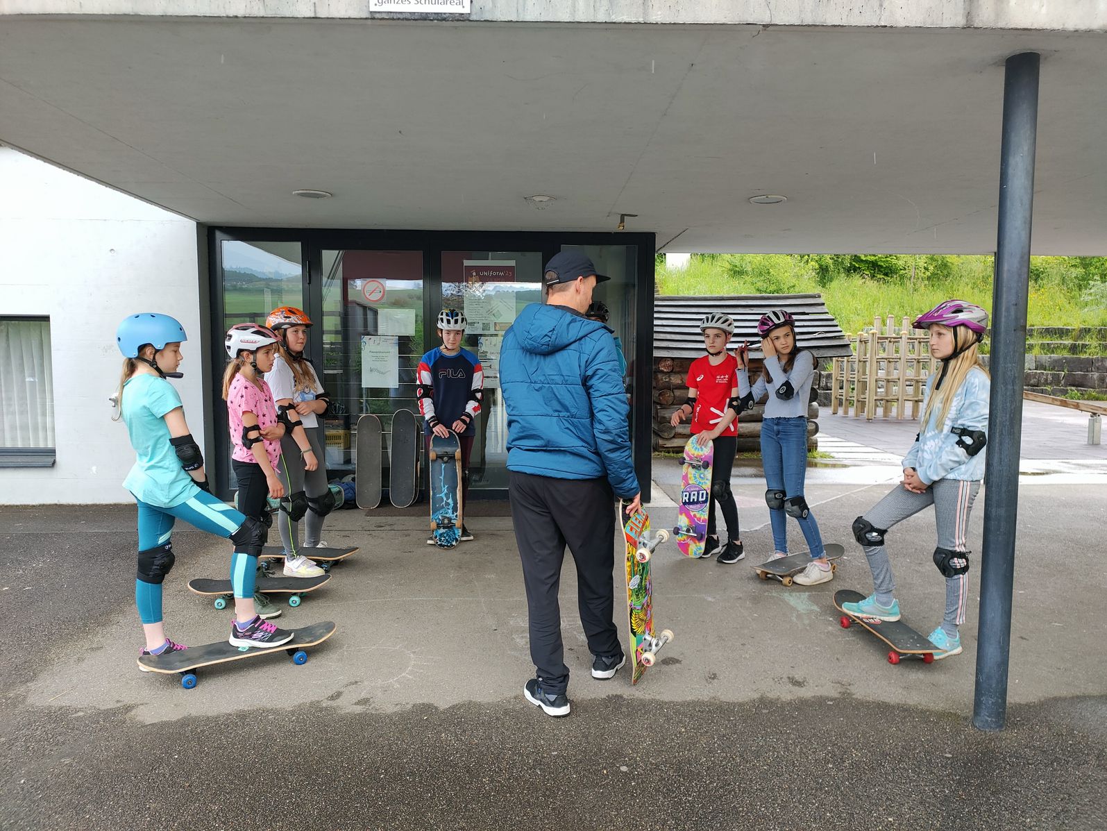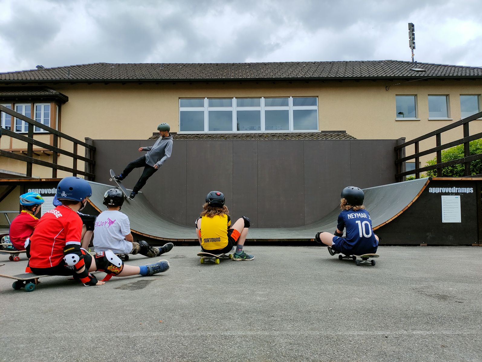 Seit Februar steht sie endlich, unsere Miniramp. Damit alle Kinder, die gerne möchten, erlernen können, wie man ein solche benutzt, hat der Skateboardlehrer Simon Krauer die 1. - 6. Klässler am 15. und 16. Mai 2023 in den Turnstunden besucht.